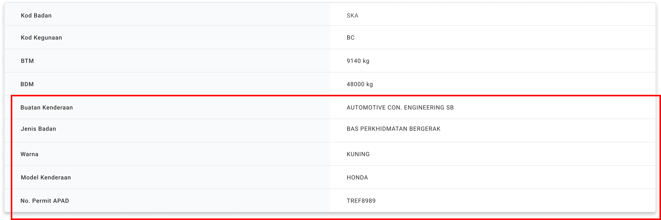 Pada header "Maklumat Penggerak Utama" dan "Maklumat Semi Trailer - Kargo Am", tambah data "Buatan Kenderaan", "Jenis Badan", "Warna", "Model Kenderaan", dan "No. Permit APAD".