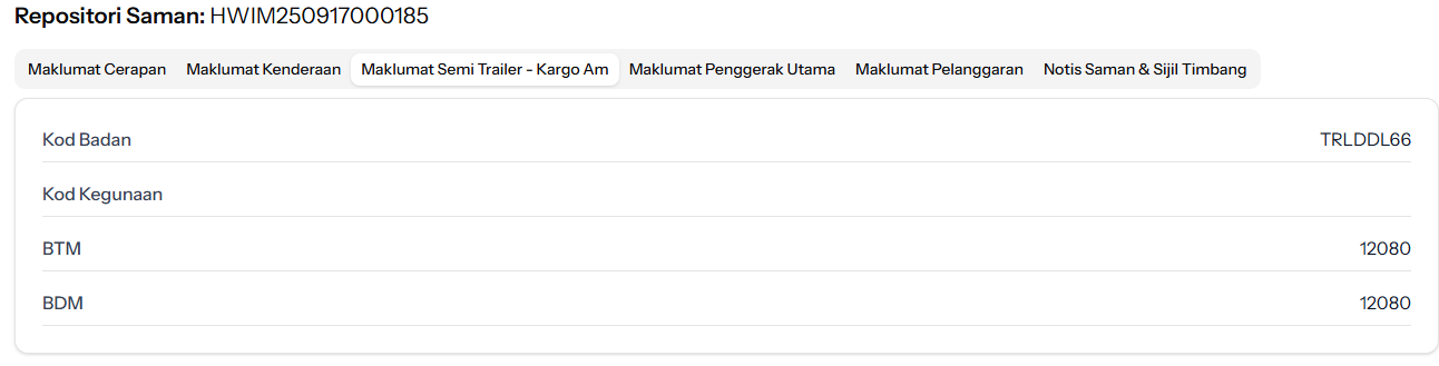 Maklumat pemilik dan maklumat kenderaan perlu dibentangkan dalam satu header dalam maklumat repositori saman, penolakan, dan siasatan.
