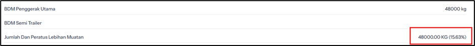 Jumlah lebihan muatan perlu dikemas kini dimana nilai lebihan muatan mengikut peratus lebihan dan format berat perlu bernombor bulat.