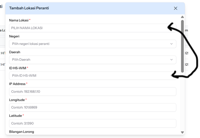 Tukar kedudukan antara medan 'Nama Lokasi' dan 'ID HS-WiM'.