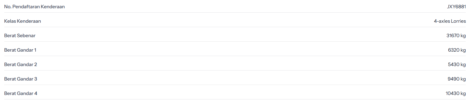Kami hanya papar berdasarkan apa yang tertera di database front end tbl_axle_data. Sila rujuk yang sepatutnya.